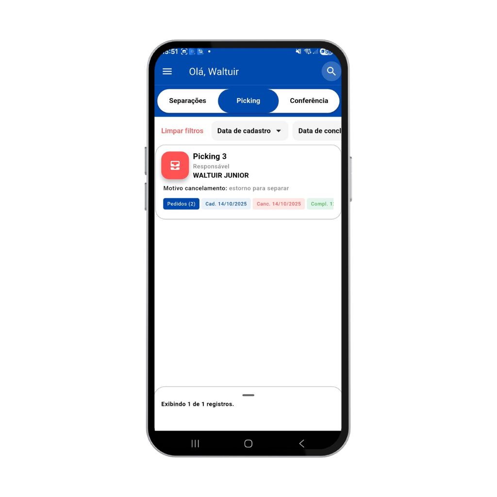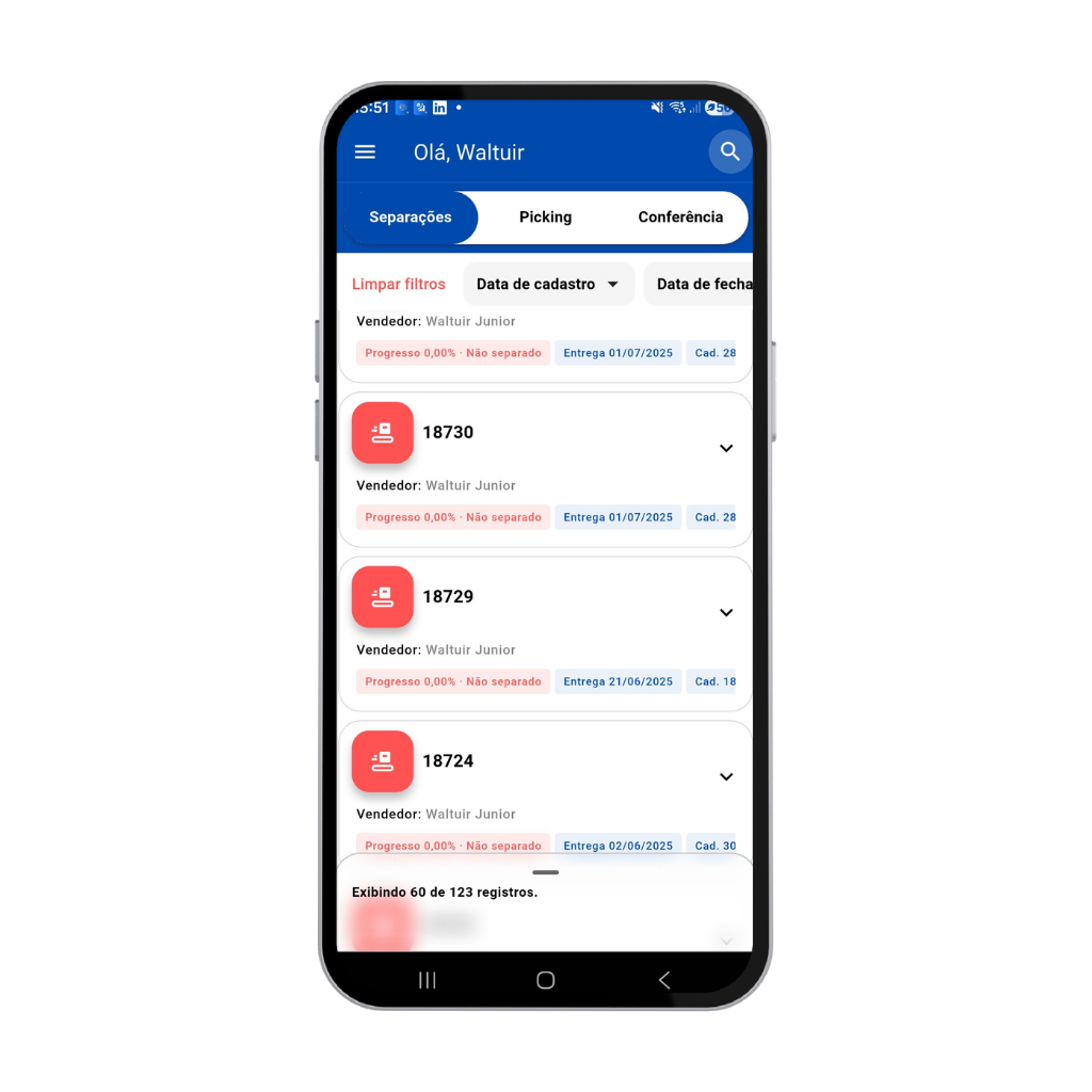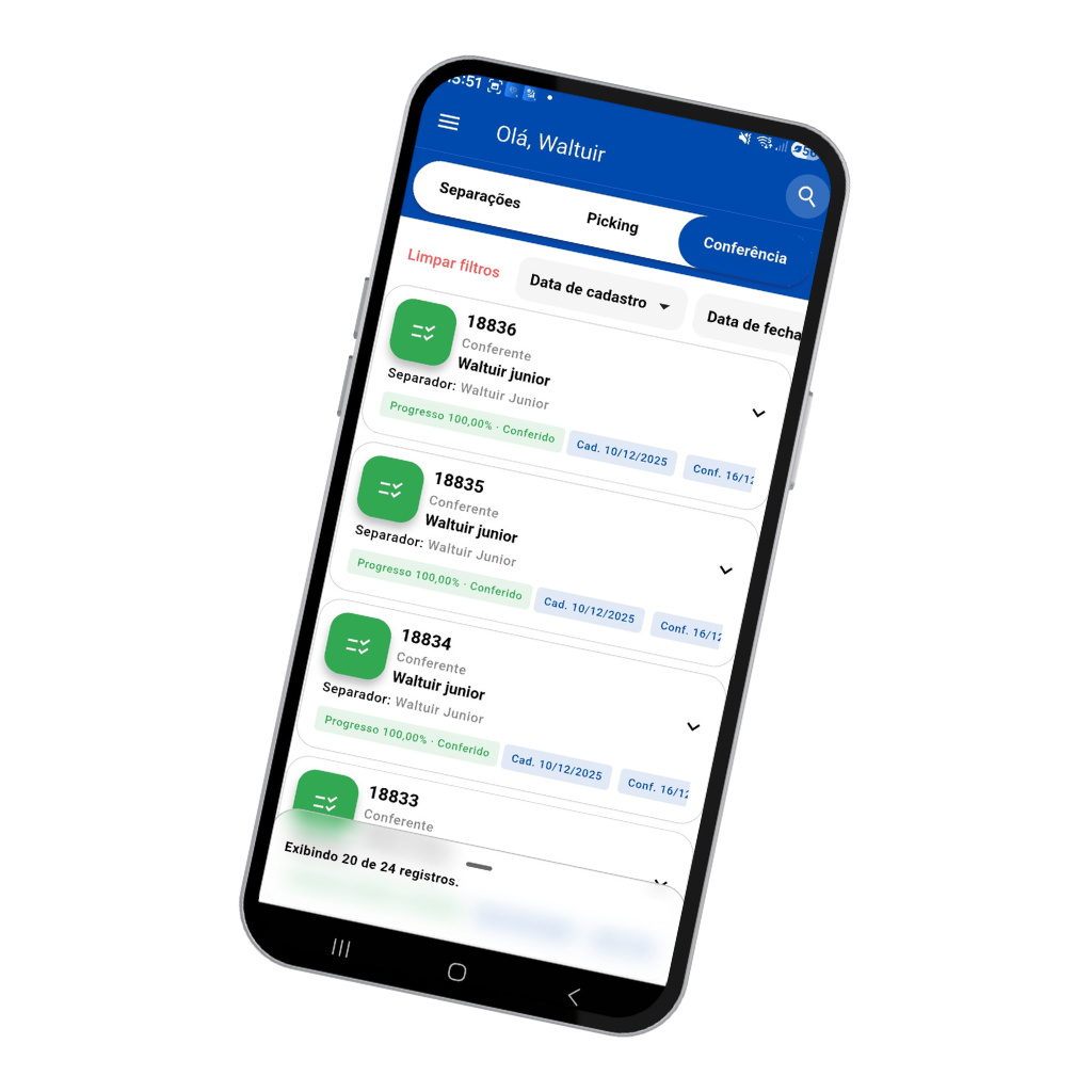 Com o App de Separação, o operador visualiza os pedidos liberados e realiza a separação de produtos no estoque de forma guiada e intuitiva. O sistema organiza os itens por pedido, evita esquecimentos e reduz erros comuns no processo manual.